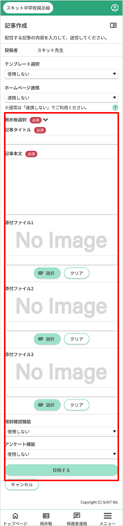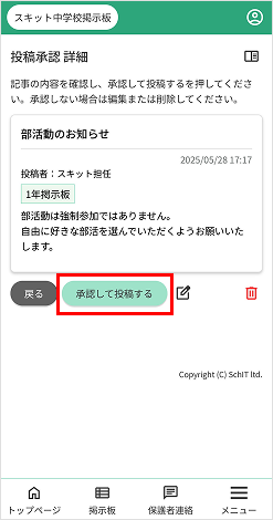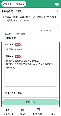 掲示板に書き込み権限のあるユーザーが作成した記事を、学校管理者が投稿承認することができます。