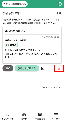 3. 投稿承認 詳細ページの削除アイコンを押下すると、記事が削除されます。