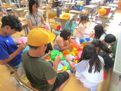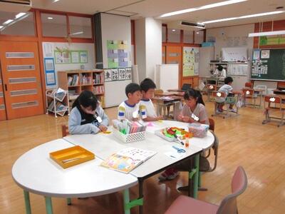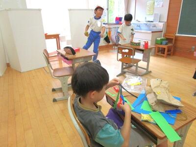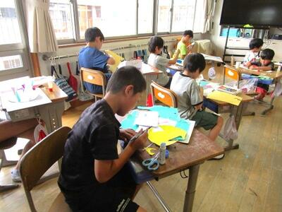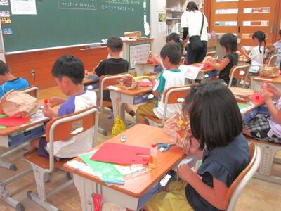 【2年生】1枚目の写真は、生活科の「うごく うごく わたしの おもちゃ」の学習の様子です。1年生との「おもちゃ祭り」に向けて、急ピッチで作成を進めています。