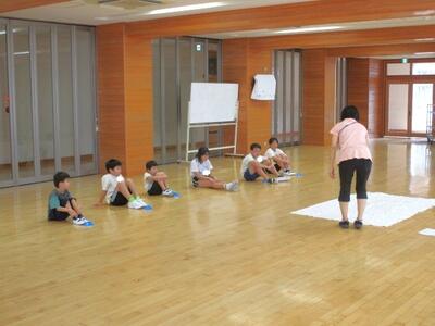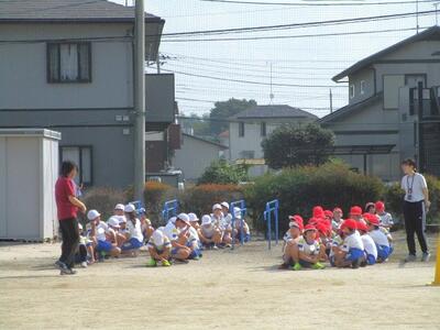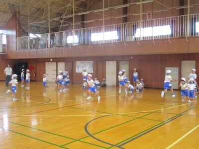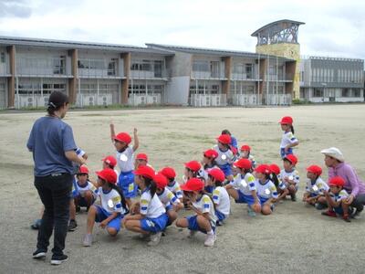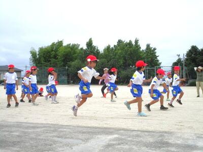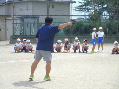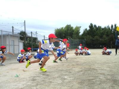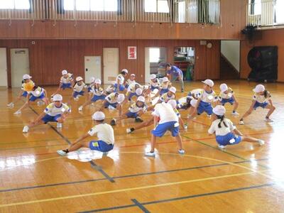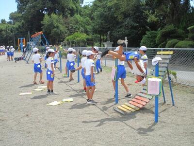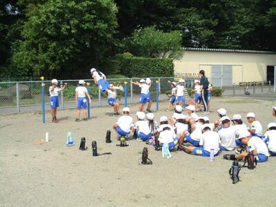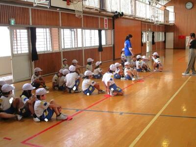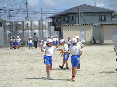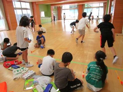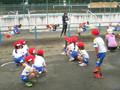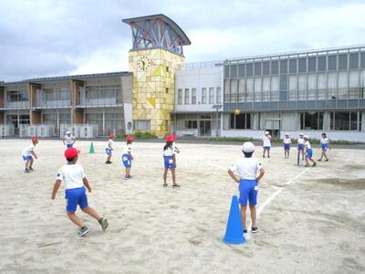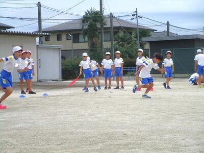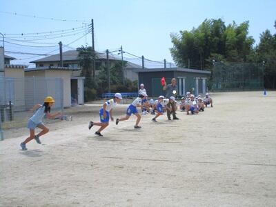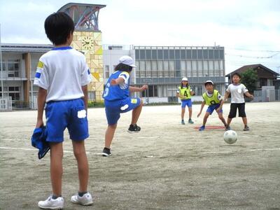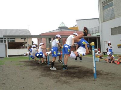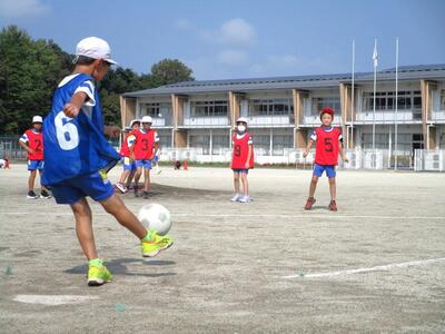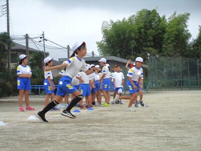 【2年生】1枚目と2枚目の写真は、運動遊びプログラムの2回目の活動の様子です。相手の陣地に行ってカラーコーンを触った方が勝ちというゲームをしています。みんな汗びっしょりになって活動していました。