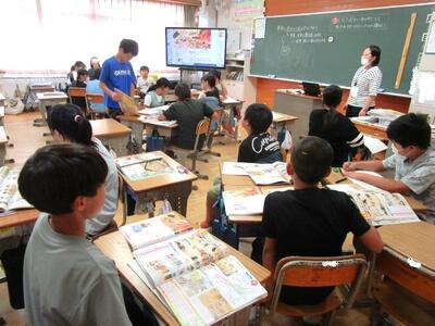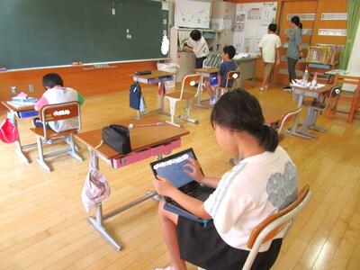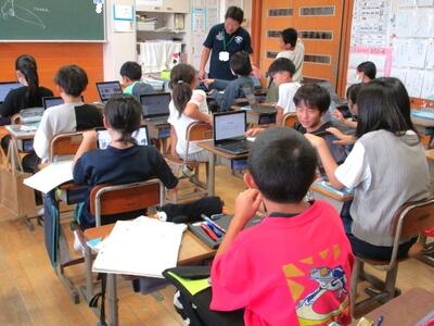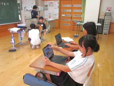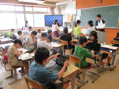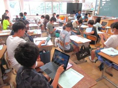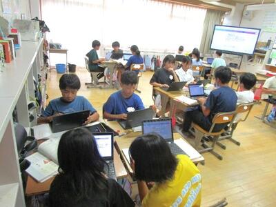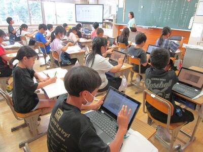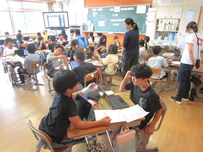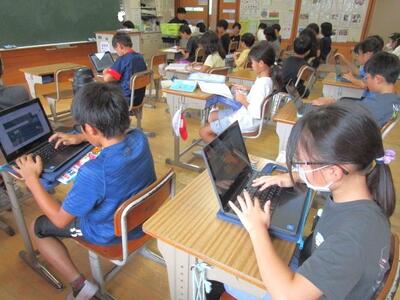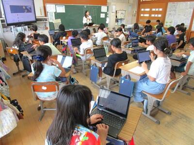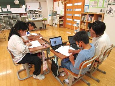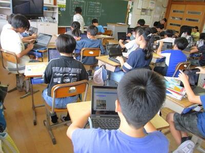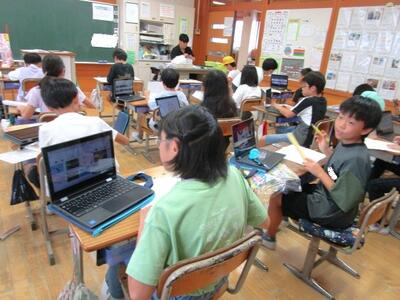 【5年生】1枚目の写真は、社会の「水産業のさかんな地域」の学習の様子です。今日は、水産業について調べ活動を行いました。水産業の不思議はみつかったかな?