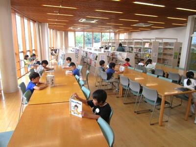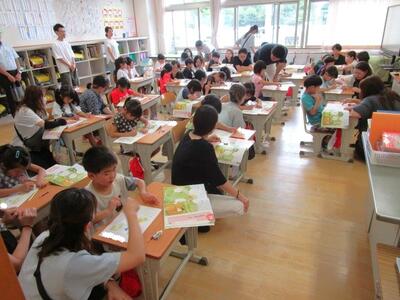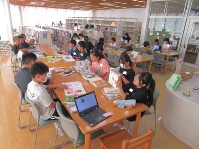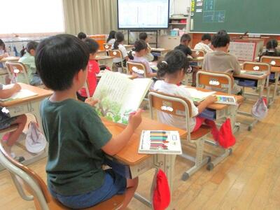 【3年生】夏休み前には、本を2冊借りることができます。1枚目の写真は、夏休み中に読む本を2冊選んでいる様子です。選び終わった児童は、すでに本の世界に浸っていました。