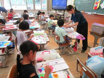【1年生】1枚目と2枚目の写真は、図画工作の時間の様子です。水彩絵の具を使って、運動会の絵の仕上げをしています。少しずつ慎重に彩色している姿が印象的です。