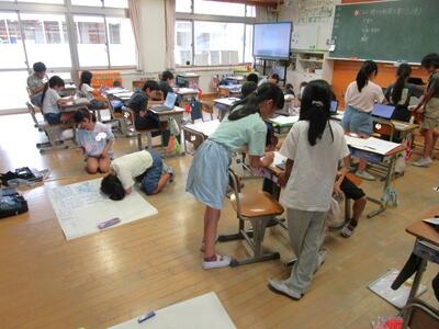 【4年生】1枚目と2枚目の写真は、社会の「くらしとごみ」の学習の様子です。どちらの教室でも、個人やグループになって、まとめの新聞づくりを夢中で行っていました。
