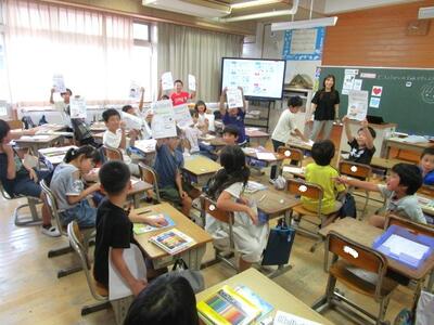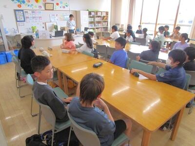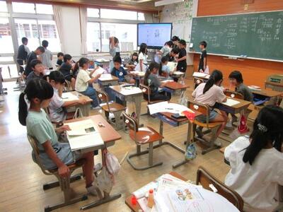 【5年生】1枚目の写真は、6年生の総合的な学習の時間に作成した古都鎌倉の様子を5年生に伝える活動をしている様子です。来年の修学旅行に役立てようと、5年生も真剣に聞いています。