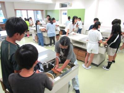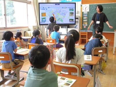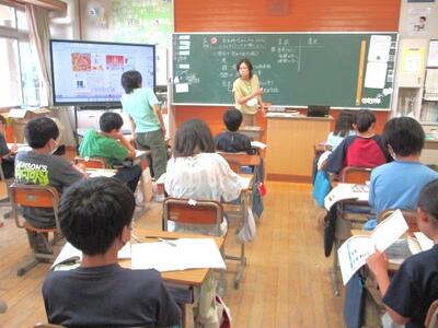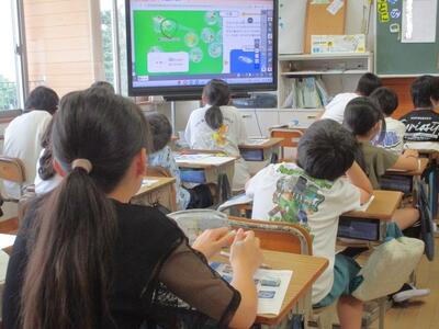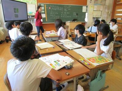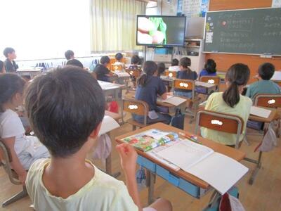 【5年生】1枚目の写真は、理科の「メダカのたんじょう」の学習の様子です。大型提示装置を使いながら、メダカの誕生の様子や特徴をみんなで調べているところです。