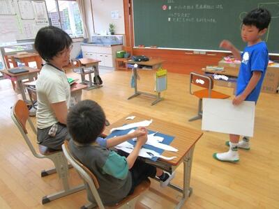 【1年生】1枚目の写真は、国語の「大きなかぶ」の学習の様子です。グループで役割分担をして、大きなかぶの劇の練習をしています。