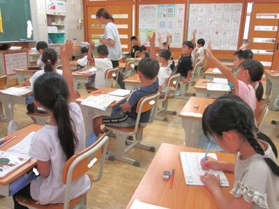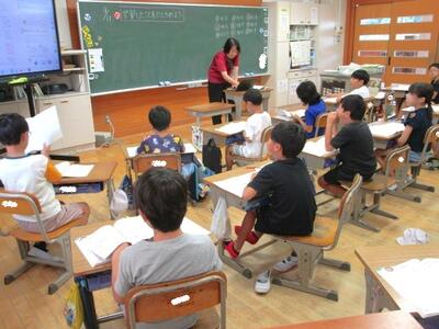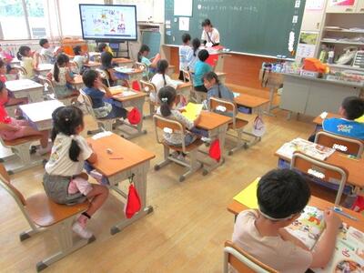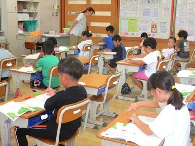 39日間の夏休みが終わり、子どもたちが元気に登校しました。朝の活動の時間には、夏休み明けの集会を行い、学校長からの話を聞きました。