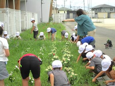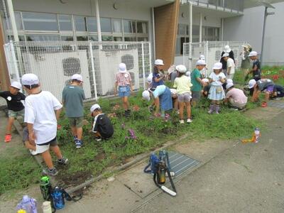 【2年生】1枚目と2枚目の写真は、教室前にある花壇の草むしりをしている様子です。袋いっぱいの草を取りました。これで気持ちよく夏休みを迎えられますね。