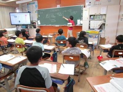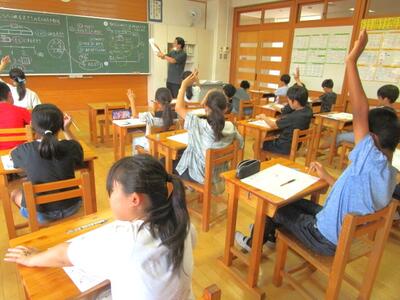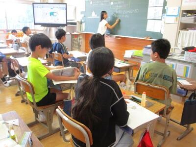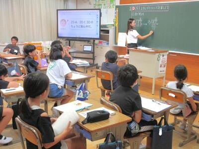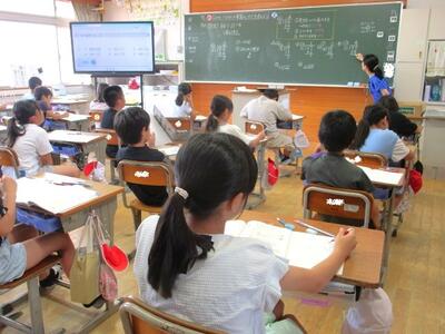 【5年生】1枚目と2枚目の写真は、算数の「比べ方を考えよう(1)」の学習の様子です。単位量当たりの大きさの学習ですから、5年生の学習の中でも一番難しい内容に入りました。