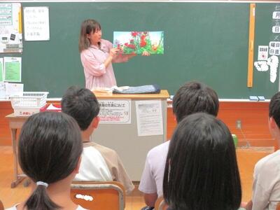 【1年生】1枚目の写真は、国語の「つぼみ」の学習の様子です。ここでは、いろいろな花のつぼみが開く様子が記されています。ちょうど「ハス」の花について学習している場面です。