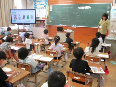 【1年生】1枚目の写真は、道徳の学習の様子です。「すてきなことば あふたあゆう」を教材とした学習で、阿久津小学校の良いところをたくさん発表していました。