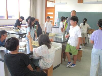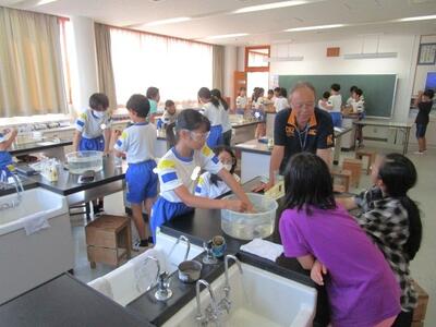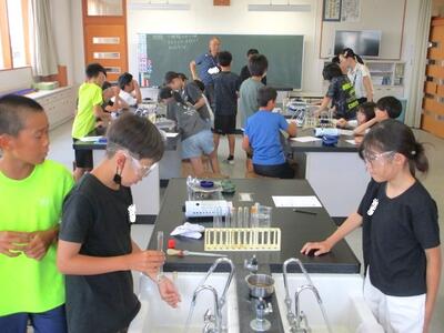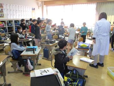 【4年生】1枚目の写真は、理科の「ものの温度と体積」の学習の様子です。空気は、温度によって体積が変わるのかを実験します。実験のやり方を真剣に聞いています。
