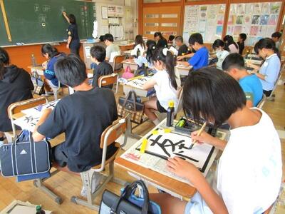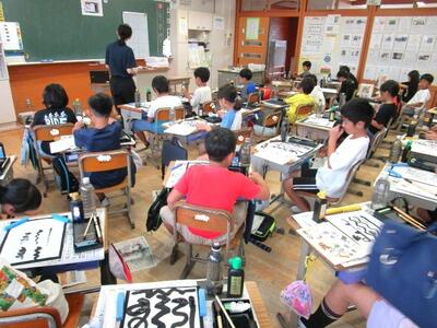 【3年生】1枚目の写真は、書写の時間の様子です。3年生になって始まった毛筆の学習も、曲げや払いなどの学習に入りました。今日は、「元」という文字の練習をしました。