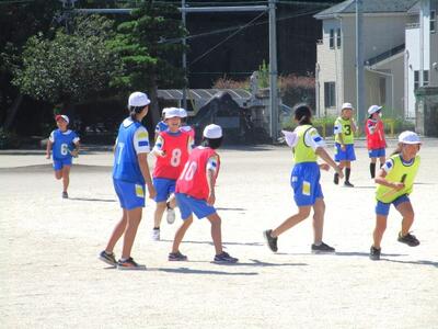 【4年生】1枚目と2枚目の写真は、体育の「タグラグビー」の学習の様子です。いよいよゲームが始まりました。タグを取られないように相手をかわす動きをするのがポイントです。