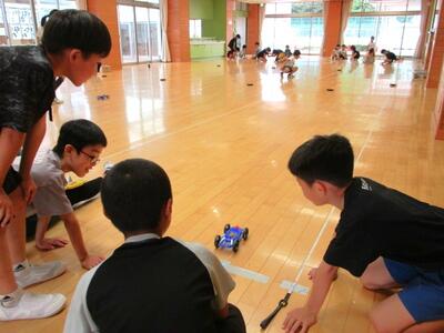 【3年生】1枚目の写真は、理科の「風とゴムの力のはたらき」の学習の様子です。今日は、風の強さを設定して、どのくらいの長さを走るのかしっかりと測っていました。
