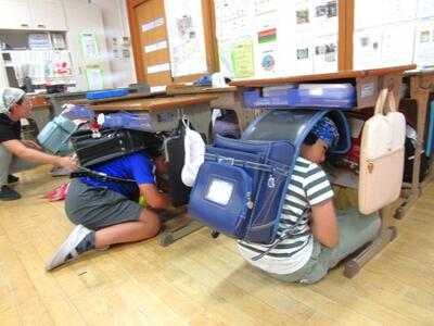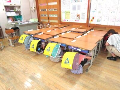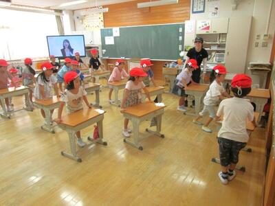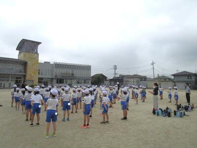 本日の2校時に、避難訓練を実施しました。地震がきた後に、理科室から出火したという想定で、各教室から校庭の南に避難しました。学校長と消防士の方の話の後、消火器の使い方について話を聞き、5・6年生の代表者が実際に消火器から水を放水させました。子どもたちには、自分を守る力を身に着けてほしいという話をしました。