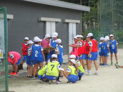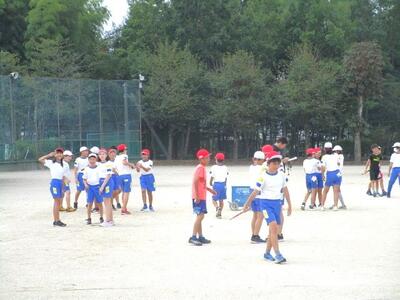 【5年生】1枚目の写真は、体育の「ティーボール」の学習の様子です。動かないボールですが、なかなかうまく打つのは難しいものです。いよいよゲームが始まりました。