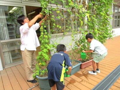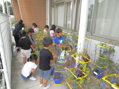 【4年生】1枚目と2枚目の写真は、理科の学習の様子です。春に植えたヘチマも少しずつ大きくなってきました。秋に行う学習に向けて、教材園に植え替えをしました。