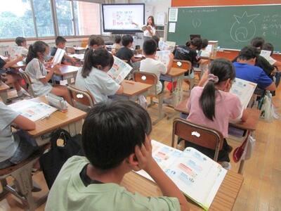 【5年生】1枚目の写真は、体育(保健)の「けがの防止」の学習の様子です。5年生の後半の保健の学習は、けがや病気の防止に関する学習を行います。