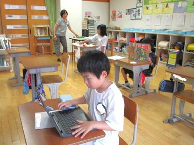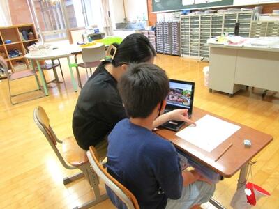 【1年生】1枚目の写真は、タブレットの使い方を学んでいる様子です。画面の立ち上げ方やシャットダウンの方法などを、まずは繰り返し練習します。