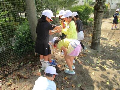 【2年生】今日は、2年生が「サツマイモほり」を行いました。つるをたどった後も、その下にサツマイモがあるのではないかと、一生懸命に探していました。しっかり収穫できました。
