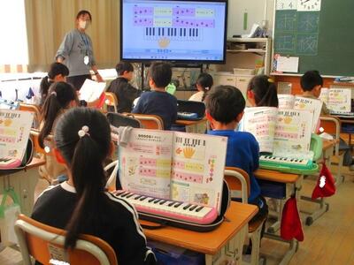 【2年生】1枚目の写真は、音楽の時間の様子です。「かえるのがっしょう」を演奏しています。このあと、グループを3つに分けて輪唱に挑戦しました。