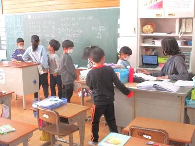 【2年生】1枚目と2枚目の写真は、算数の時間の様子です。かけ算の学習も、後半の6・7・8の段に入りました。時々かけ算九九の検定を行って、しっかりと覚えられるように頑張っています。