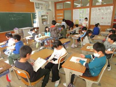 【5年生】1枚目の写真は、「人権週間」に係る活動を行っています。人権に関する本を読み聞かせしているのです。子どもたちは、いつもの授業とはちがう雰囲気で聞き入っていました。