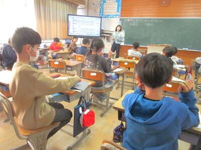 【4年生】1枚目の写真は、算数の時間の様子です。今日は、「たしかめよう」の問題を解きました。ちょうど答え合わせをしている場面です。
