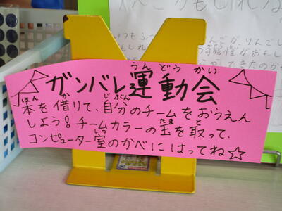 少し前から、”ガンバレ運動会”企画として、玉入れのチーム(A、B、C)毎に本の読む数を競い合って、本を1冊借りるとそれぞれの色のついた玉をもらい、壁面に貼っていくというイベントを行っています。全て、図書ボランティアの方々の手作り、子どもたちも玉を入れていくのが楽しみで、毎日本を借りに来ています。楽しいイベントを企画していただきありがとうございます。子どもたちは嬉しそうに玉を壁に貼り付けていました。