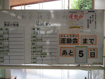 運動会の練習ボードには「運動会まであと6日」となり、本日も各学年・ブロックで練習予定が組まれていましたが、体育館での練習に切り替わったり、延期になったりしました。