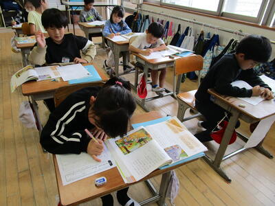 金曜の午後の学校を歩いてみると、3年生では書写、外国語活動、国語などの授業が行われていました。