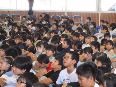 内容としては、今年は阿久津小学校の創立150周年記念の節目の年で、1年間を通してさまざまなイベントを行っているが、このような活動を通して「受け継いだ伝統を未来へつなぐこと」、や「阿久津小学校をもっと好きになってほしいこと」などを話しました。また、1年間のちょうど半分の折り返し地点のため、これまでを振り返って、よく頑張ったことは自分をほめてほしいこと、また、反省すべき点は、2学期に生かし、「自分と未来を変えていく」ことなどを話しました。