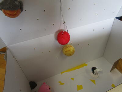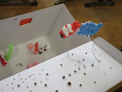 1年図画工作「やぶいたかたちからうまれたよ」も、きれいに掲示されています。