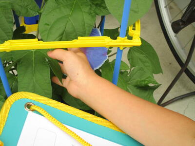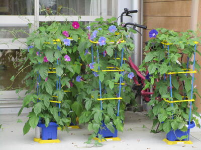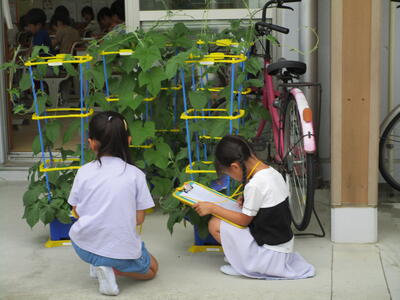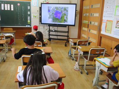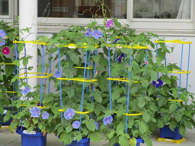 1年生の教室前のアサガオも、花をたくさんつけるようになりました。