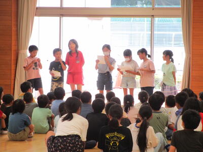 全校集会の中の校長の話では、4月からこれまでを振り返ってどうだったか、自分を振り返る活動と、夏休みに向けてのお願いをしました。