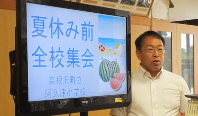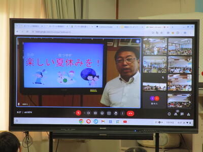 今日は、夏休みを控え、1校時に「夏休み前 全校集会」ということで、校長室と各教室をリモートで結んで行いました。
