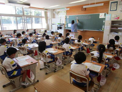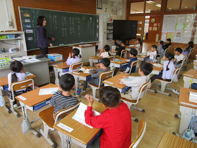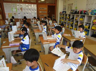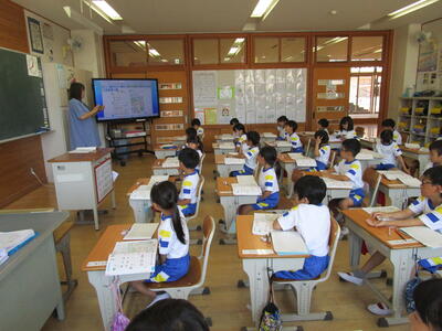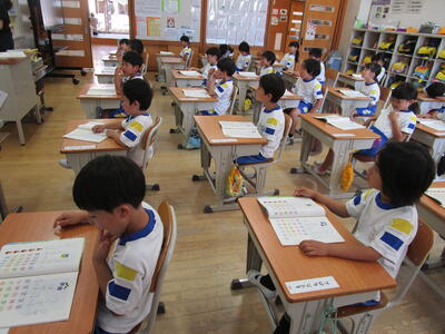 1年生の教室は、国語、算数を行っていました。入学して2か月余り、勉強に集中しています。