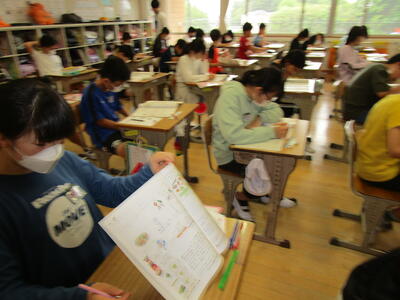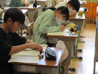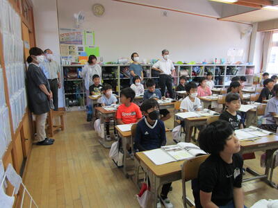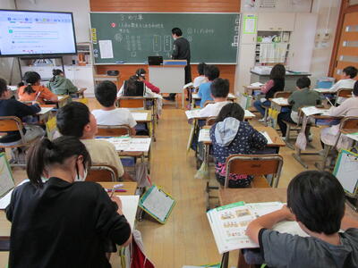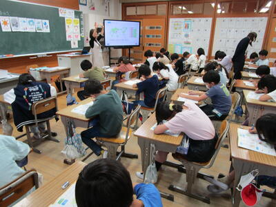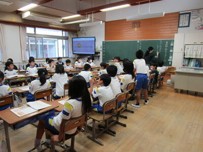 5・6年生の教室では、どのクラスも真剣な表情で授業に取り組んでいました。さすが上級生だけあって、「よい姿勢」を保って参加しています。また、今年力を入れて取り組んでいる「返事」もきちんと言える子が増えてきたような気がします。大変立派です。