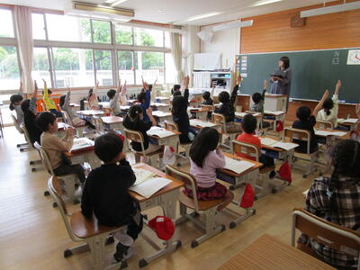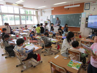 また、1年生では「国語」や「算数」の授業が行われていました。1年生も5月になり各教科の授業が進められています。手をまっすぐにあげたり、本を読む姿勢を意識したりしながら、積極的に学習に取り組んでいます。また、算数ではドリル問題に取り組み、先生に丸をもらっていました。