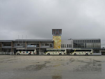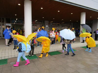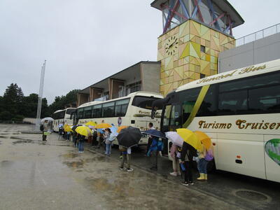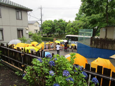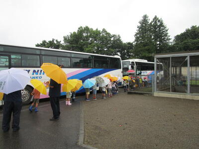 あいにくの雨となりましたが、バス2台に分乗して幼稚園に出発しました。