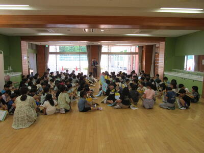 発達段階や季節に応じて選んでいただいた絵本等をおもちいただき、各教室において子どもたちに、表情・感情豊かに読み聞かせを行っていました。