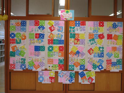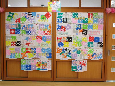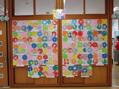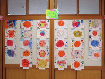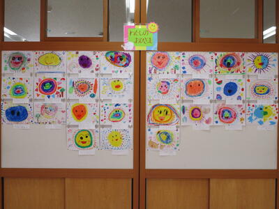 1年生のクラスの廊下を歩いてみると、図画工作の作品がきれいに掲示されていました。題名は「わたしのおひさま」です。子どもたちの創造性あふれる力作ばかりです。