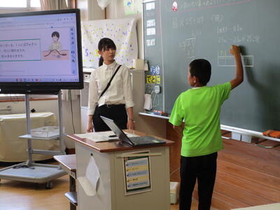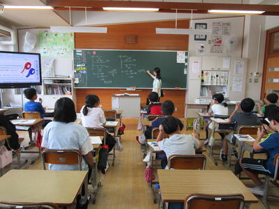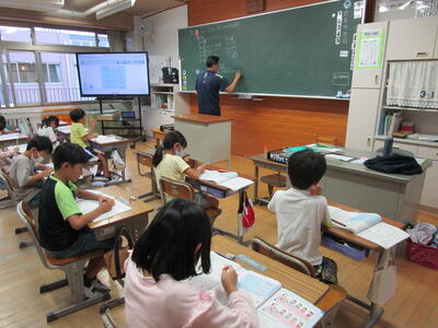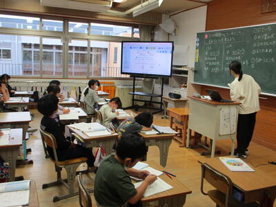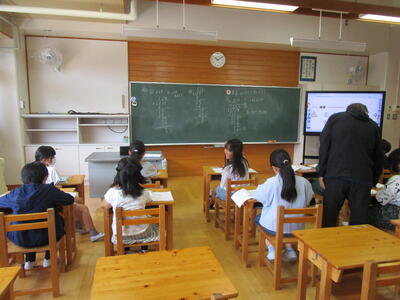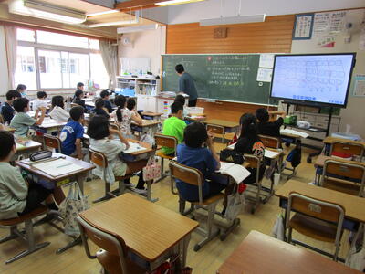3年生では、「算数」の授業が行われ、各クラスとも内容は「わり算」でした。12個のお菓子を3人で等しく分けるにはどうしたらよいかを考えていました。デジタル教科書や黒板などを使いながら、視覚的に分かるように授業が進められていました。子どもたちも自分の考えをしっかりともちながら楽しそうに学習に励んでしました。