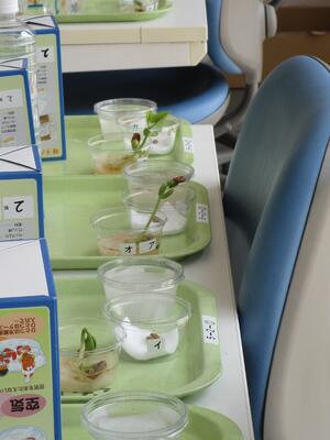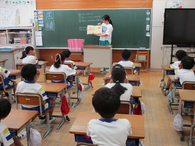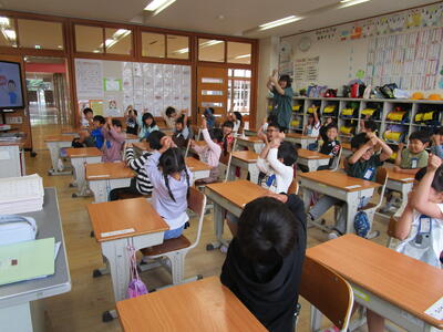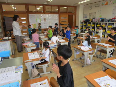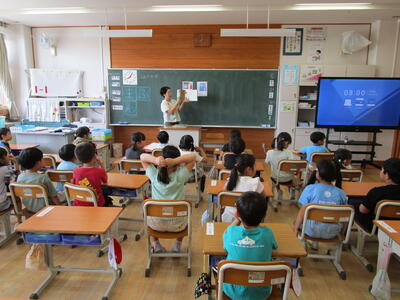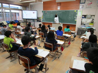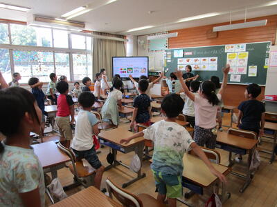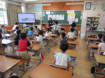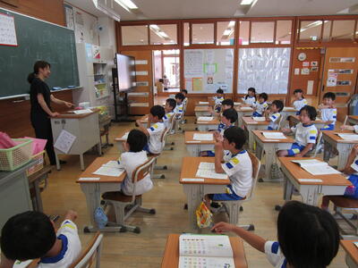 2年生の教室は、外国語活動、体育を行っていました。外国語活動ではいろいろな食べ物をイラストで示しながら、好きな食べ物をイエス・ノーでジェスチャーで答えていました。