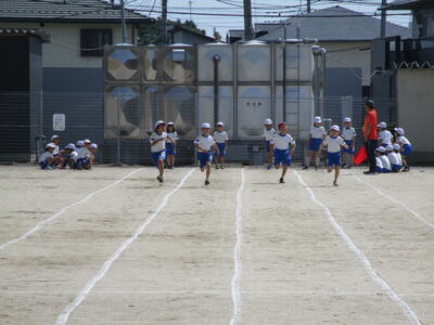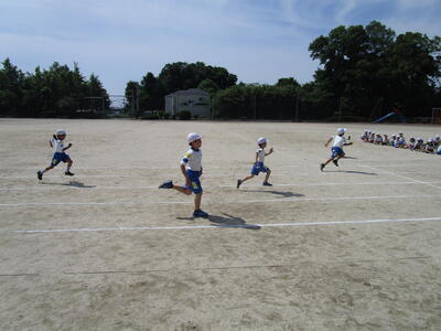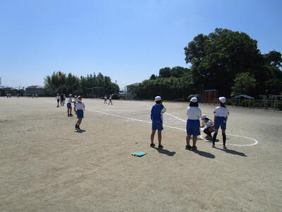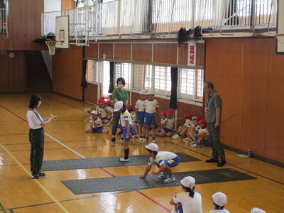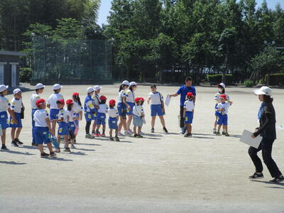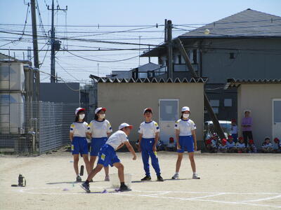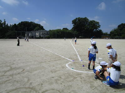 6年生にとっては、1年生の面倒をみたり、結果を測定したりすることをとおして思いやりを育むきっかけとなり、また、1年生にとっては、6年生の試技を見学し、自分たちに比べるとけた外れの記録を出す6年生を目の当たりにして、将来はああなりたいという憧れを抱くことになります。これらは、異学年交流の良さです。