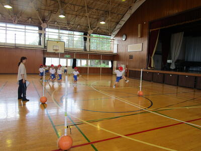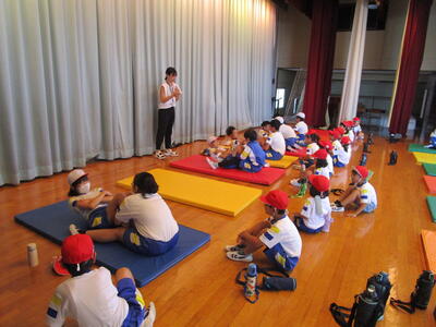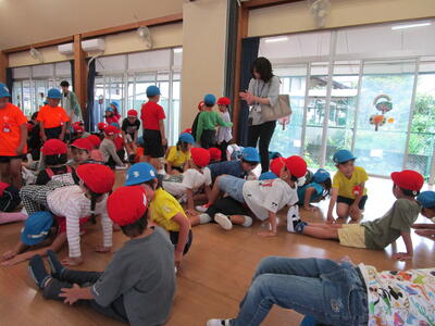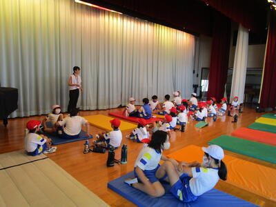 幼稚園につくとホールに集まり、幼稚園の先生の指導により体操などをしながら、徐々にリラックスしていきました。