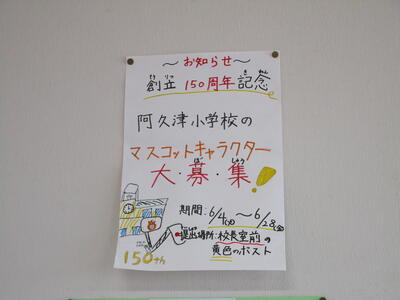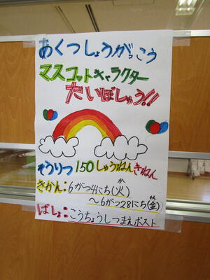 ところで、6月4日(火)から募集を開始した創立150年記念のマスコットキャラクターですが、現在までの応募数を確認したところ(水曜日現在ですが)なんと、153作品の応募がありました。児童の皆さん、たくさんのご応募ありがとうございます。〆切は6月28日(金)なので、まだまだ募集中です!引き続き、力作をお待ちしております。