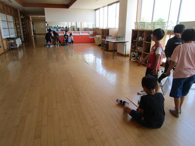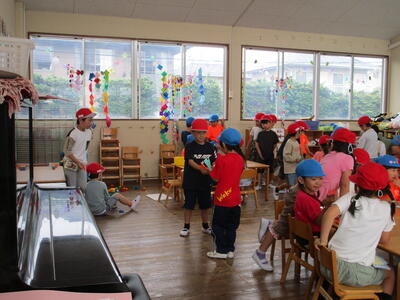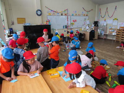 その後は、雨のため園庭ではなく、年長さんの教室で室内遊びを楽しみました。